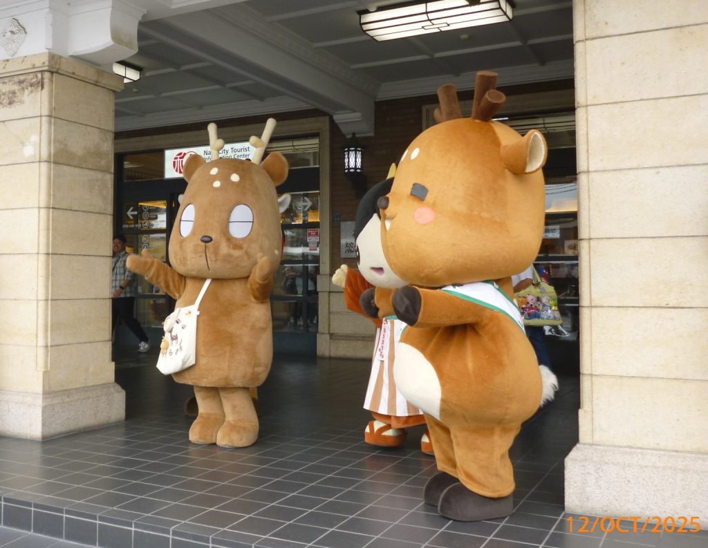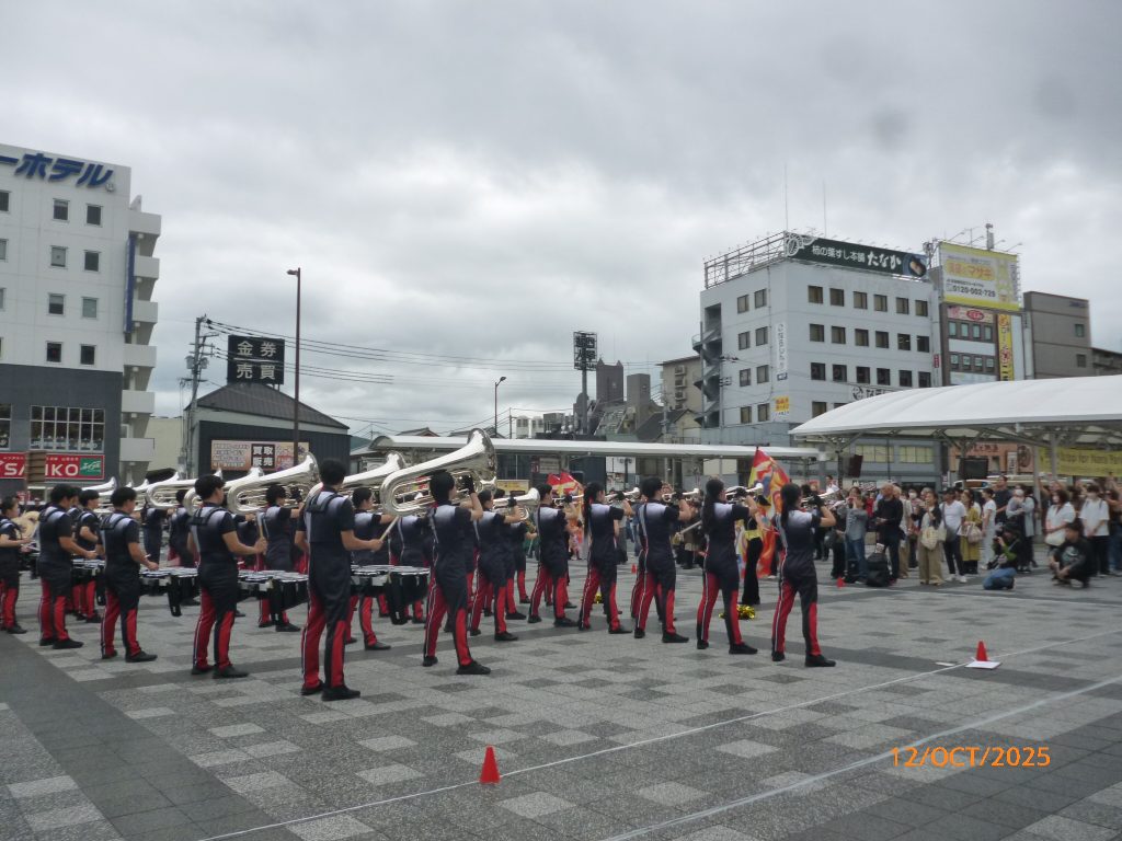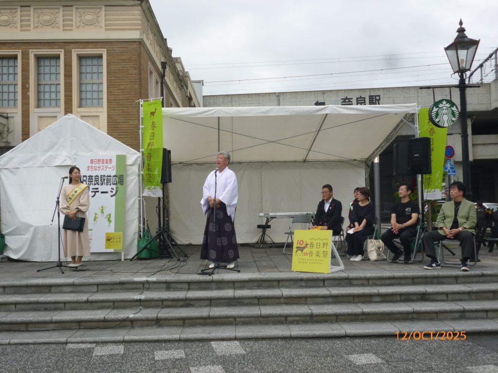 10月12日(日)10時20分から春日野音楽祭のオープニングセレモニーとして、JR奈良駅東口広場で多くの観客の皆さんの注目の中、ゆるキャラたちと一緒に世界手洗いダンスを奉納しました。引き続いて開会のご挨拶、マーチングバンドの演奏と音楽会が幕開けしました。