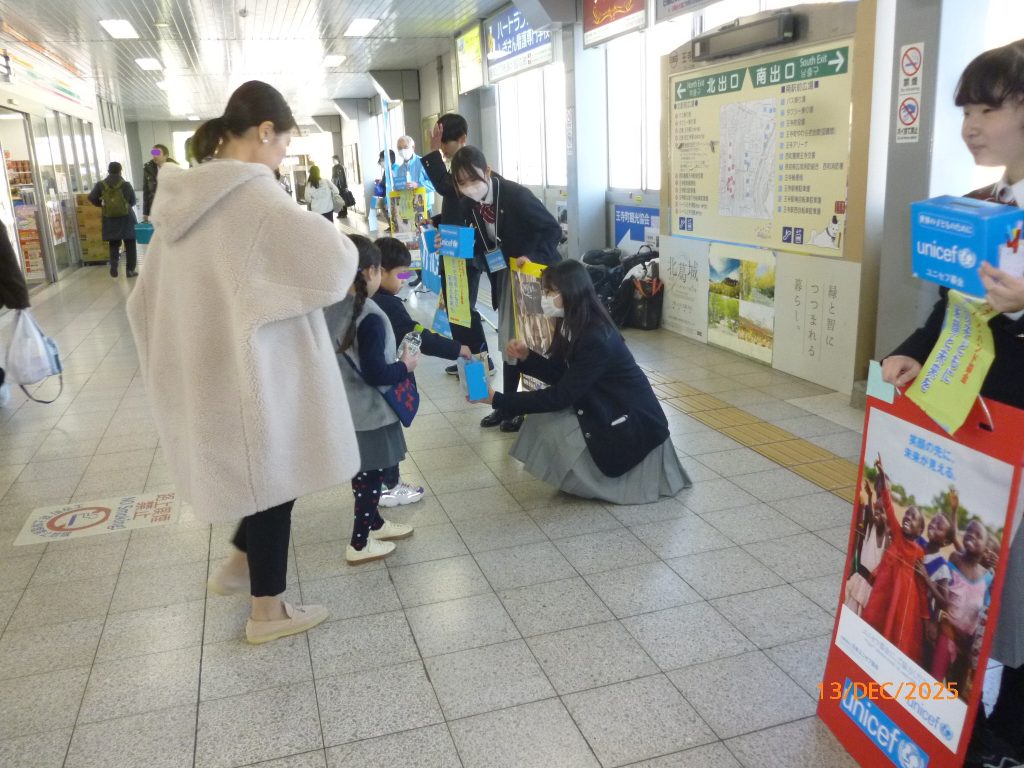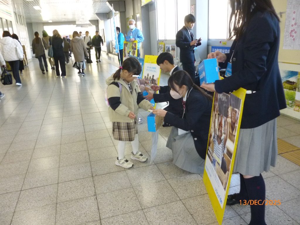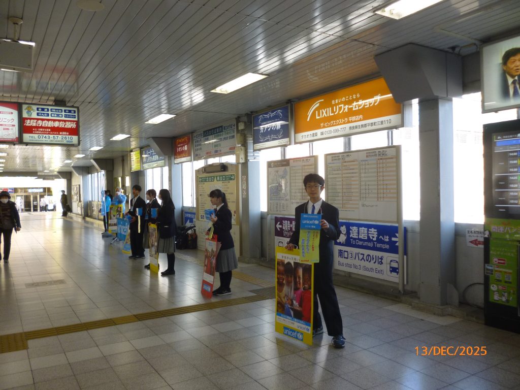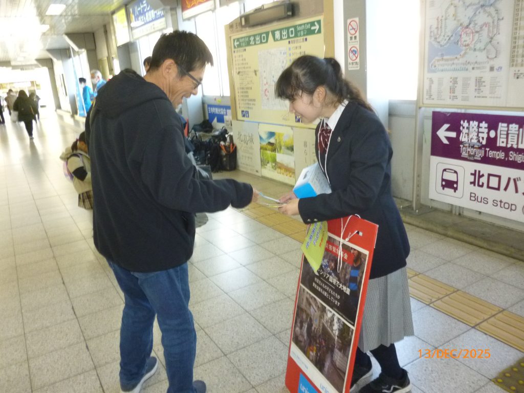 12月13日(土)に第47回ハンドインハンド募金第2弾をJR王寺駅の南北通路で行いました。寒い日でしたが午後からは西大和学園の生徒会の皆さん10名がお手伝い頂き、ご通行の皆さんに大きな声で募金を呼び掛けてくれ、たくさんのご寄付を頂きました。ご協力ありがとうございました。