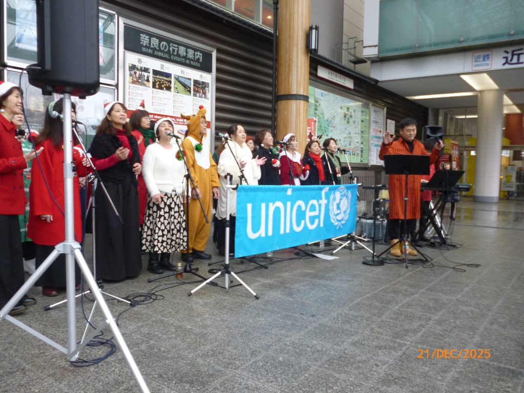 12月21日(日)近鉄奈良駅前で今年最後のハンドインハンド募金第5弾を行いました。生憎の雨でしたがボランティア8名で募金を始め、13時過ぎからは、ブライトン・ゴスペル・クアイア―の皆さん24名のクリスマスソング(動画)が始まると、一般の通行人に加え海外からの観光客の皆さんも立ち止まり、ブライトンさんのゴスペルを楽しむ人が増え、寄付していただく人も増えてきました。